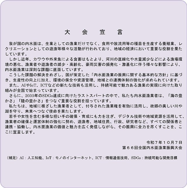 第66回全国内水面漁業振興大会を、令和7年10月7日石川県金沢市の「石川県立音楽堂邦楽ホール」において開催しました。