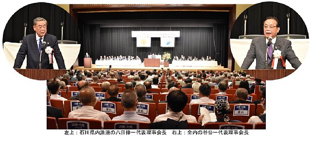 全内の滑川幸男副会長理事が開会を宣言し、谷公一代表理事会長の主催者挨拶、石川県内漁連の八田伸一代表理事会長より開催担当挨拶を行いました。