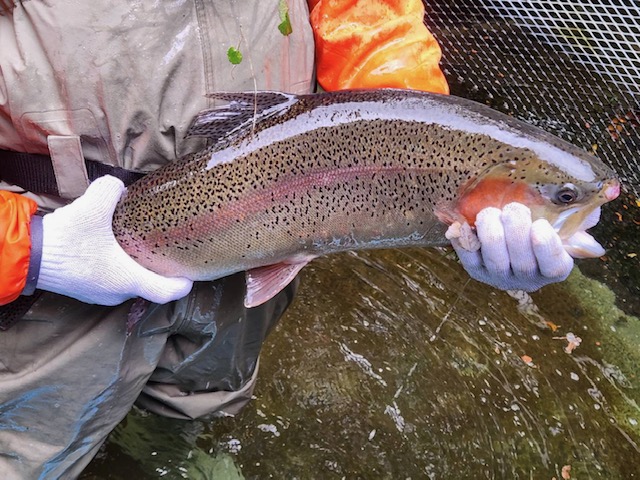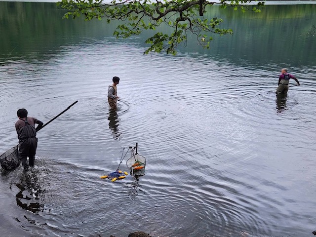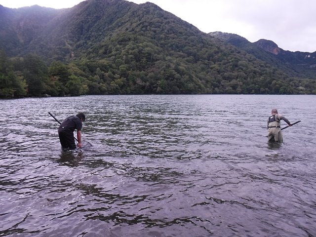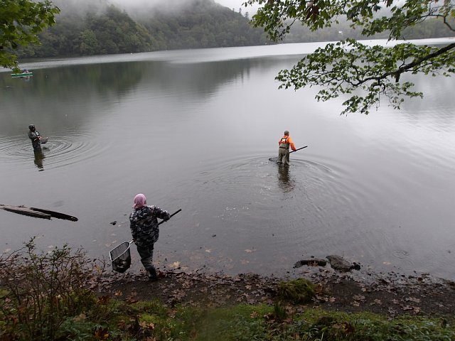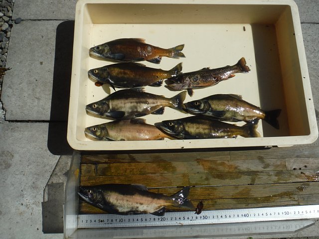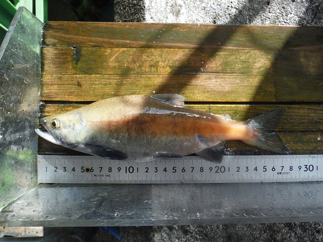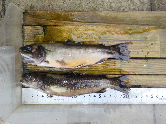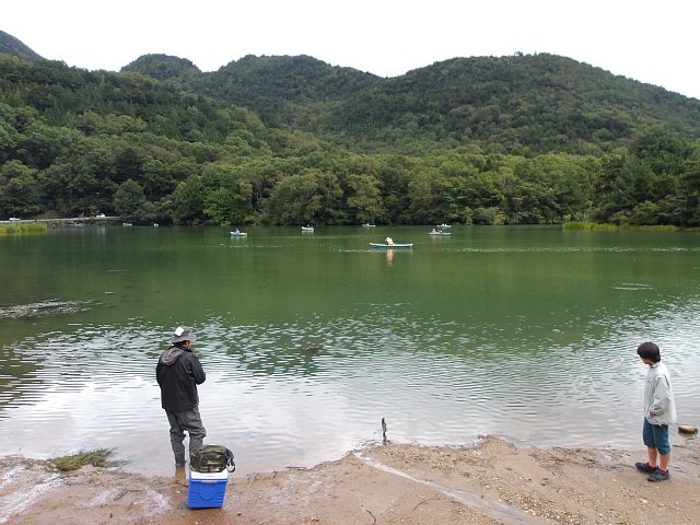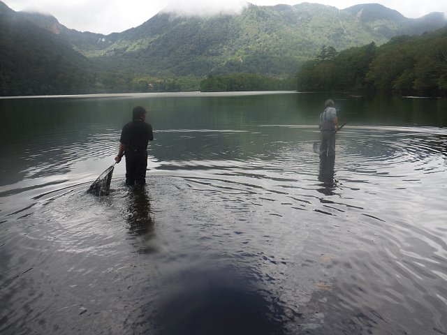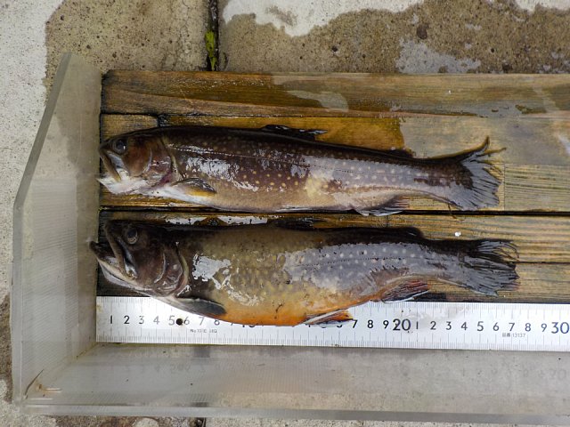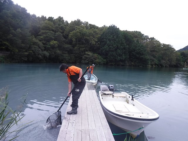 気温 水温 午前中は雨が降りましたが、午後は晴れ間が見られ、秋らしい天気となりました。 滝上に婚姻色のヒメマスが寄ってきていて、エデンのピンク/シルバーで27.4cmのヒメマス2尾釣れていました。底付近で釣れたとのことです。 レストハウス前ではブドウ虫エサでホンマス24.3cm、カワマス23.2cm他ニジマス4尾の釣果がありました。 一本杭では銀色のヒメマスとニジマスがたくさ釣れていました。タナは5mで岸よりのほうが釣果が良いとのことです。一本杭では水温が下がって、釣果が良くなってきているようです。 |