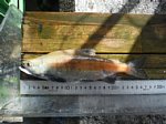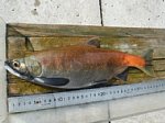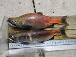 気温 水温 今日も婚姻色ヒメマスが釣れていました。清水ではスピアヘッドリュウキ50Sワカサギカラーで37.6cmのヒメマスが釣れ年間トラウトランキング暫定2位となりました。底を狙ったほうが良いとのことで、他に3尾のヒメマスを釣りました。 他の方も清水で35.9cmの婚姻色ヒメマスをラパラCD3ピンク色で釣り上げました。他2尾のヒメマスが釣れたようです。 |